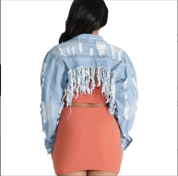 - "Shredder" Blue Jean Denim Jacket With Rips and Fringe For Ladies (S-5XL)