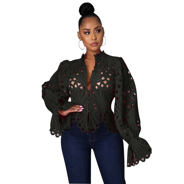 "Poppin' Petals" Elegant Long Sleeve Sheer Mesh Lace Shirts For Ladies